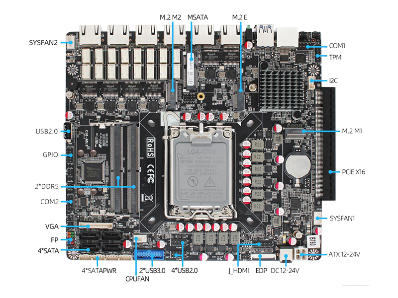 | 工业网络安全主板,ITX工业主板 支持英特尔12-13-14代i3/i5/i7 LGA 1700 CPU 板载 6×RJ45(Intel i225/i226),2*SFP光纤可选 1×HDMI+1×VGA+1×EDP 三显,同/异步显示 2×SO-DDR5/5600MHz 内存插槽,最大 64G 内存 支持4×USB3.0,5×USB2.0 版型尺寸200mm×180mm 支持网络唤醒、上电开机、看门狗等 产品符合CE FCC ROHS规范 |