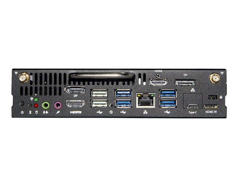 I/O | USB 3.0 USB2.0 Type-c RJ45 HDMI IN HDMI DVI DP HDMI 80pin Power button Reset LED灯 DC JACK 一键还原 音频 | 4× USB3.0 2× USB2.0 1×type-c(可选为网口) 1×RJ45 1×HDMI IN(可选) 1×HDMI(独显) 1×DVI(独显) 1×DP(集显) 1×HDMI(集显) 1×OPS电脑80pin 1× power button 1 × Reset button 1 x 电源指标灯&1x硬盘指标灯 1 × DC JACK 1 x 一键还原 1 × LINE-OUT & MIC-IN ,集成6声道音效ALC897声卡芯片 |