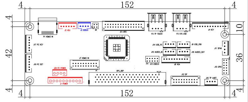 HDMI2 IN VGA USB AUDEO SPAK DP OUT USB3.0 USB-PC GPIO TP UART PC KEY AUDEO-OUT PC DET PC POWER | 1X12PIN 电源输入接口 1X6PIN 背光控制接口 1X4PIN UART DEBUG遥控按键接口 1X14PIN TV遥控按键接口 2X15PIN LVDS输出接口 2X2PIN 屏电源选择接口 2X10PIN 输入扩展接口 1X10PIN 输入扩展接口 1X4PIN 输出接口 1X4PIN 音频输入接口 1X4PIN 喇叭接口 双15W功放 2X10PIN DP输出接口 1XUSB3.0 1XUSB2.0 触摸通讯接口 1X10PIN System GPIO备用接口 1X4PIN 触摸通讯接口 1X6PIN System/Android遥控按键接口 1X4PIN System Audio主机音频输出接口 1X6PIN System GPIO 开关机运行检测和控制 1X4PIN OPS主机独立电源 |